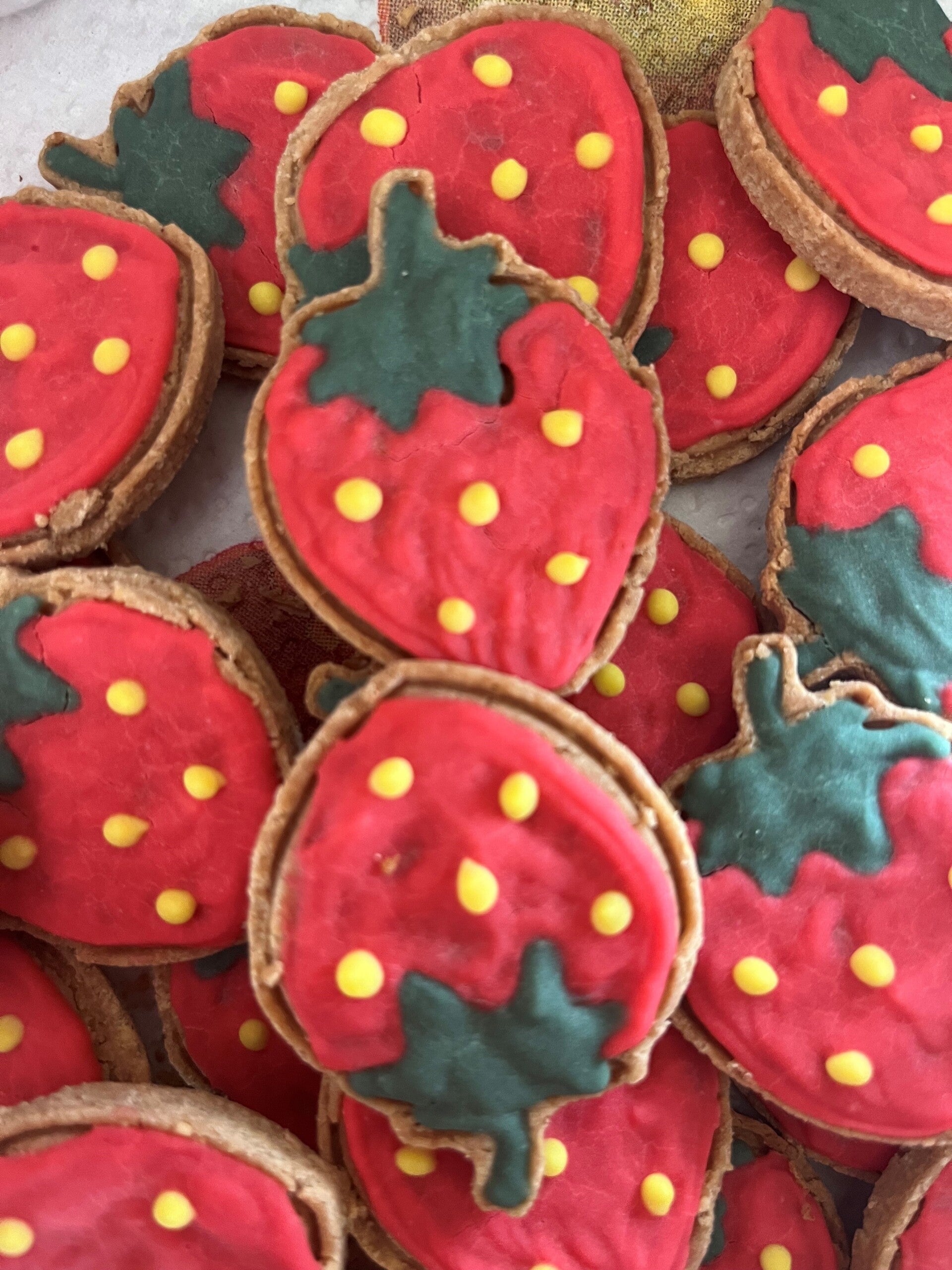 Composition: beurre de cacahuètes 100%, farine de sarrasin bio, eau. Glaçage ; yogourt grec bio, farine de tapioca bio, colorant naturel en poudre.